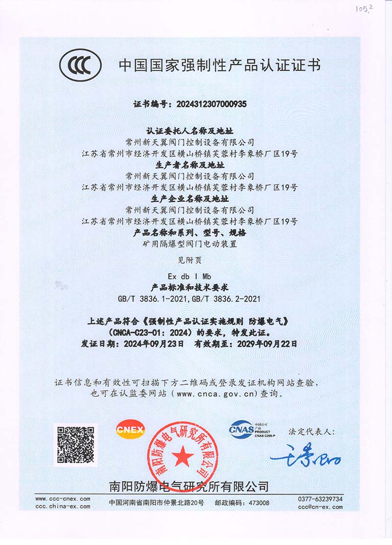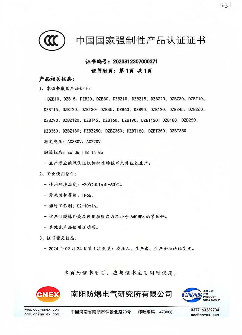 隔爆型DZB 中國國家強制性產品認證證書108.2